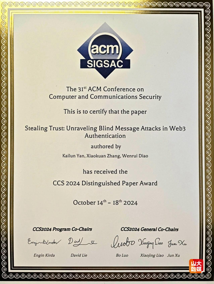 科研水平持续提升。进一步强化有组织科研,加强顶层设计,开展科研力量的前瞻性部署和战略性储备。新增科研立项24项,其中包括国家重点研发项目2项、国家自然基金重点项目1项、国家自然基金人才项目1项、国家自然基金博士生项目1项,获山东省技术发明一等奖1项。发表高水平论文100余篇,包括密码与网络安全类顶级会议论文20篇,获CCS杰出论文奖1项、Inscrypt2024最佳论文奖1项、ISIT学生论文奖1项。聚焦网络安全热点问题,提交智库研究文章20余篇,为国家相关部门决策提供有力支撑。