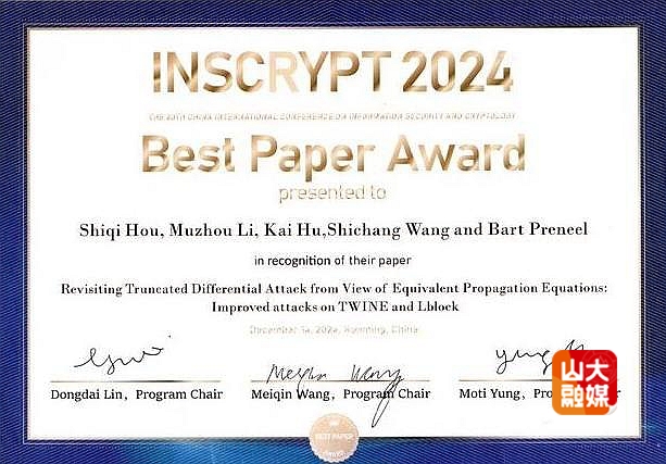 国际交流合作呈现新亮点。打造网安国际名家讲坛,邀请包括图灵奖得主、欧洲科学院院士等在内的14位国际顶尖专家学者访问并作报告,引进短期境外专家3人。与南洋理工大学和鲁汶大学建立联合培养机制,初步形成双学位博士生培养意向,获得国家留学基金委创新型国际合作培养项目立项。两门境外师资课程获评山东大学2024年暑期学校优秀项目。学生年度赴境外参加国际会议、寒暑期课程等40余人次,参与海外经历项目10人次。联合承办第20届信息安全与密码学国际会议,学院教师任大会联合主席和程序委员会联合主席。
