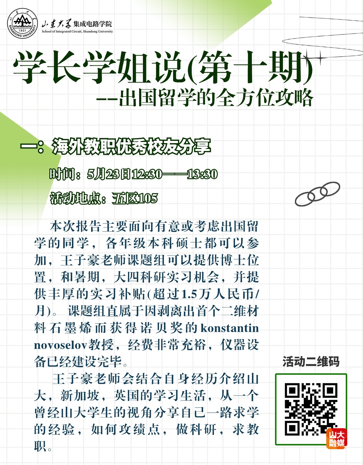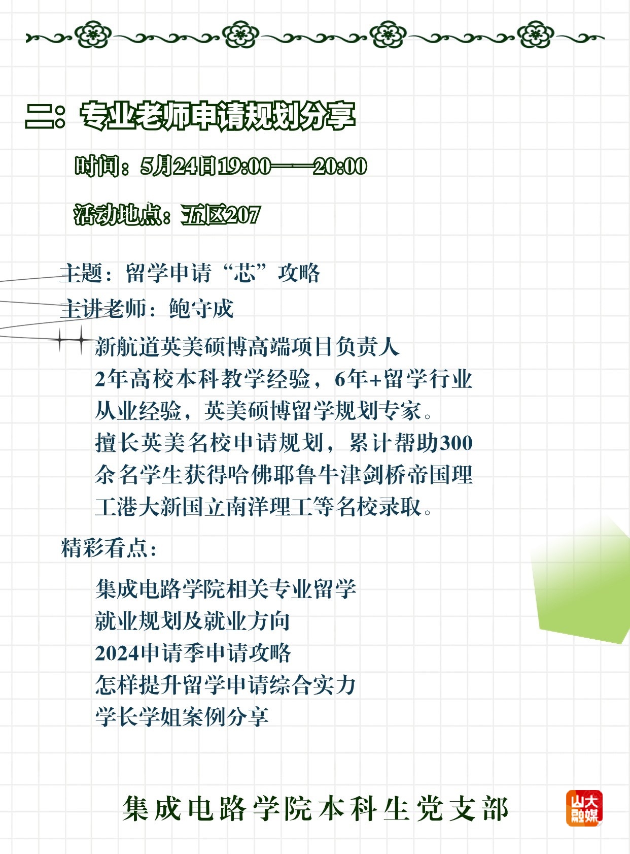 创新活动形式。在深化思想教育的基础上,本科生党支部积极开展主题党日活动。通过组织“学长学姐说”系列分享会以及追“芯”前行优秀学子采访等,进一步将党建工作与实际需求相结合,不断增强学生党员的使命感与责任感。