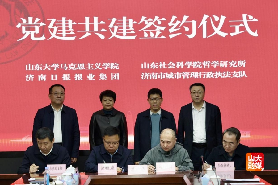 [本站讯]3月12日,山东大学马克思主义学院与济南市城管局执法支队、山东社科院哲学研究所和济南日报报业集团举行党建共建签约仪式,共同签署党建共建合作备忘录。马克思主义学院党委书记鞠晗,济南市城管局党组书记、局长董庆哲,山东社会科学院哲学研究所所长、研究员颜景高,济南日报报业集团党委书记、董事长、济南日报社社长田俊林出席签约仪式。