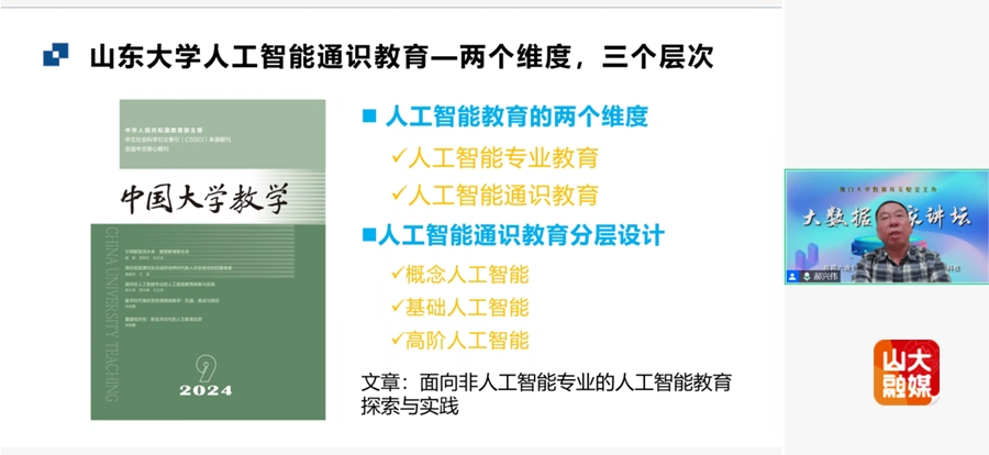 [本站讯]3月22日晚,应厦门大学数据库实验室大数据百家讲坛的邀请,山东大学计算中心主任、软件学院郝兴伟教授以在线直播的形式作了题为《山东大学人工智能教育“1+N+X”课程体系设计与教学实践》的专题分享,吸引了全国超过42000人在线收听。