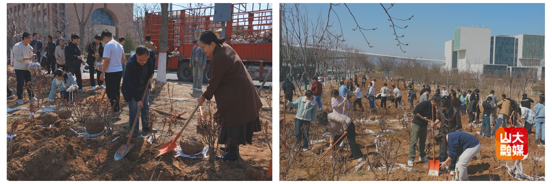 这片寄托校友对母校的深深眷恋与情怀的校友林位于青岛校区博物馆东侧,本次种植的牡丹苗都是来自校友的捐赠。在专业园林师傅现场指导后,师生们迅速投入实践。劳动现场热火朝天,师生们或躬身埋土,或蹲地扶苗,衣襟沾泥却笑意盈盈,大家齐心协力,将一棵棵承载着希望的花苗植入校园。百余株牡丹新苗错落而立,点缀着校园的春日,也成为校友们对母校、恩师、同窗的情谊的寄托。