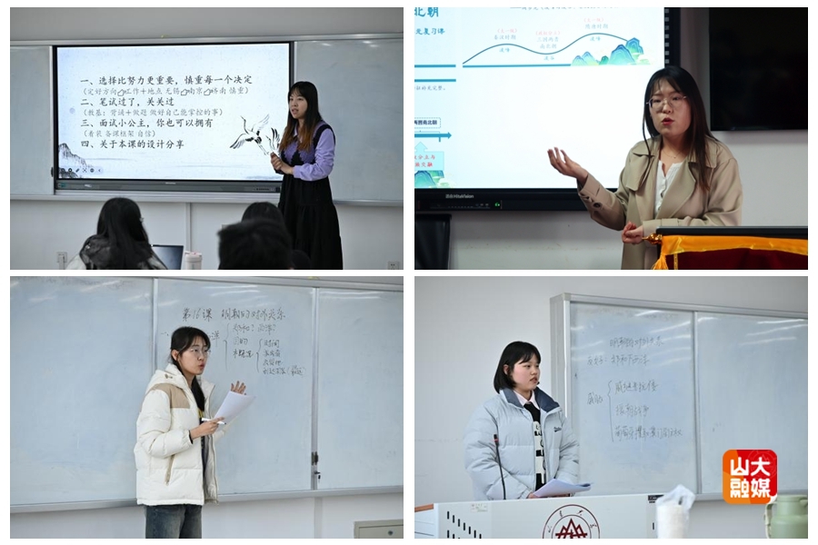 杏坛薪火一脉相承,三尺讲台实练砺能。教师讲课培训系列讲座邀请山大附中刘心宇老师和许欣楠老师主讲,延续学院“传帮带”优良传统,帮助学生提升讲课实战能力。她们系统讲解备课框架构建方法,强调“目标导向、提前规划”的教学理念;聚焦课堂设计艺术,建议各位同学设计课程“出彩点”,提出“情境创设、图表辅助”的创新思路,指导学员打造课程亮点。在实战演练环节,参训学员围绕“明朝对外关系”和“隋唐中外文化交流”主题进行限时备课与模拟授课。评委从教学设计、课堂呈现、师生互动等维度进行专业点评,助力学员提升教学综合素养。