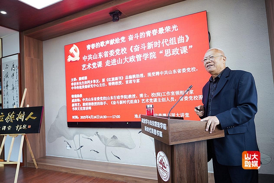 [本站讯]在五四青年节即将到来之际,4月24日,《红旗画刊》原总编辑助理,中共山东省委党校中华传统美德研究中心主任、首席专家、特聘教授殷昭俐携《奋斗新时代组曲》艺术党课走进山东大学政治学与公共管理学院新时代美德书屋“立德树人”大讲堂,以艺术赋能思政教育为主题,为师生带来一场兼具艺术性与教育性的精神盛宴。周恩来总理原秘书、武警指挥学院原副院长纪东将军出席活动。