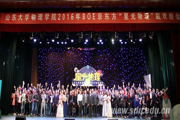 [本站讯]近日,物理学院2016年BOE京东方“星光物理”联欢晚会在中心校区举行。京东方科技集团副总裁、山东大学物理学院1978级校友曹红,中国人民解放军七一七七七部队政治委员邵东,山东大学学生就业创业指导中心主任肖祥,山东大学党委研究生工作部副部长程翠玉,物理学院党委书记李建平,院长陈峰,党委副书记张倩、吴天柱应邀参加了本次晚会。