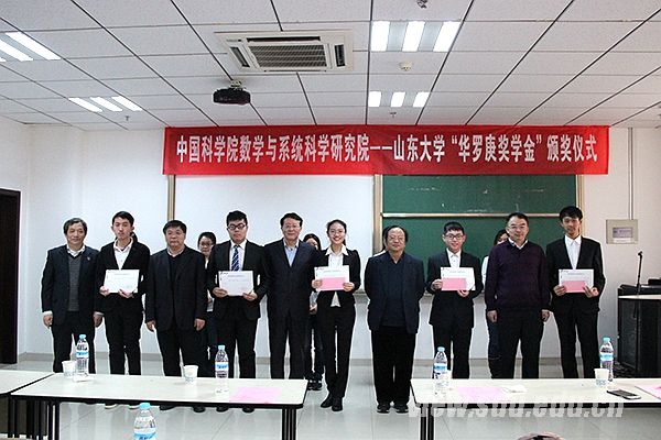 [本站讯]12月31日,中国科学院数学与系统科学研究院——山东大学“华罗庚奖学金”颁奖仪式及系列学术报告会在山东大学中心校区举行。中国科学院院士、山东大学彭实戈教授出席相关学术报告会。华罗庚先生之子华光;中科院数学与系统科学研究院副院长巩馥洲,研究生部主任邵欣、副主任刘霞;山东大学本科生院院长赵炳新,数学学院院长、金融研究院院长陈增敬出席颁奖仪式,并向山东大学20位获得“华罗庚奖学金”的学生颁奖。颁奖仪式由山东大学数学学院党委书记吴臻主持。