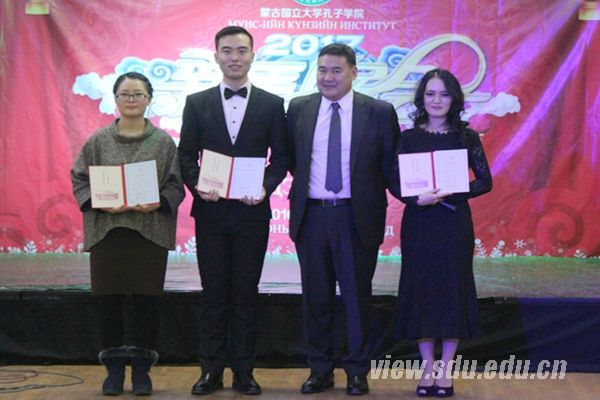 [本站讯]12月30日山东大学国际教育学院派出的国际汉语教师志愿者庞仕英同学和李青同学获得蒙古国立大学优秀外籍教师荣誉证书。蒙古国立大学副校长兼孔子学院理事长孟和巴特代表蒙古国立大学在孔院新年晚会上为获奖教师颁奖,以嘉奖两位教师在汉语推广和文化交流工作中的杰出表现。