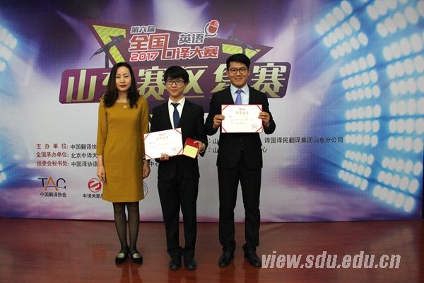 [本站讯]4月22日,2017年第六届全国口译大赛(英语)山东赛区复赛在济南举行。山东大学外语学院2015级李原秋和孟帅分获冠亚军并包揽一等奖。