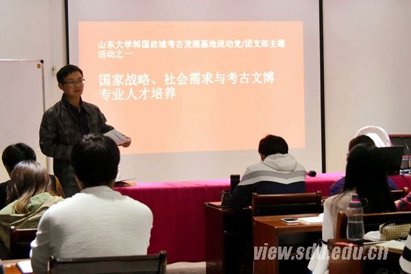 流动党支部书记郎剑锋介绍了开展此次活动的背景,受学院党委、团委委托介绍了流动党支部、流动团支部班子成员,并从党和国家对考古文物事业和文化遗产保护工作的高度重视、新形势下社会及用人单位对考古文博专业人才的需求、教育部本科教学评估及学校本科专业培养修订工作等几个方面,就活动主题进行了简要说明。