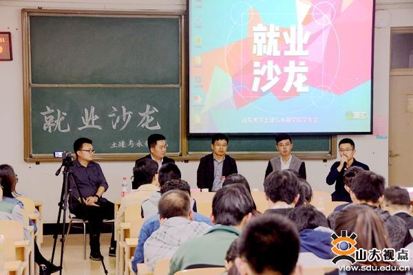[本站讯]4月27日,土建与水利学院在兴隆山校区举办就业沙龙活动。原恒大集团山东公司招聘负责人、泰禾集团人力资源经理李昊,金科地产集团人力资源经理王超,原华润置地招聘经理、银盛泰集团济南招聘负责人张大鹏,绿地集团山东绿地控股集团招聘经理张明宇,原恒大集团、绿地集团人力资源经理张凯元出席活动。