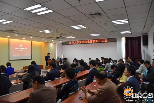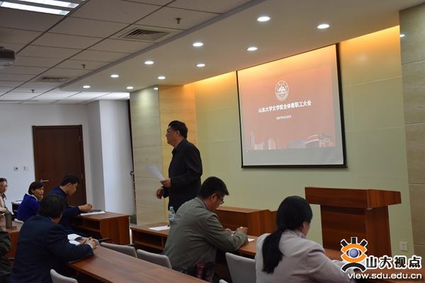 [本站讯]近日,文学院在中心校区知新楼召开全体教职工大会传达学校文件,部署近期工作。院长郑春主持会议并讲话,学院全体教职工参加会议。