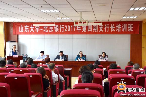[本站讯]5月11日,山东大学—北京银行2017年第四期支行行长培训班开班仪式在中心校区举行。北京银行济南分行党委书记、常务副行长房旭,山东大学经济学院党委书记王秀丽,北京银行总行人力资源部培训经理史新刚,山东大学经济学院办公室主任马燕出席开班典礼。