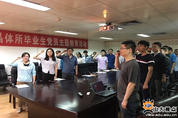 活动中,程秀凤介绍了晶体所今年毕业生工作的大致时间安排以及开展全体毕业生党员主题教育活动的重要意义。晶体所2017届毕业生辅导员廉刚带领毕业生党员学习习近平总书记五四青年节在中国政法大学的讲话。她要求全体毕业生党员从自身做起,端正态度、强化意识,今后在各自的岗位上努力工作。党旗下,全体党支部成员重温入党誓词,并表示在新的工作岗位上严格要求自己,充分发挥党员模范带头作用,践行庄严的承诺,爱党爱国,为了祖国发展与社会进步奉献自己的热血青春。会上,晶体所党务秘书向全体毕业生党员传达了山东大学党委组织部《关于做好2017年毕业生党员组织关系转移工作的通知》,要求全体党员认真对待此项工作,及时、准确填报个人信息,保证毕业生党员组织关系转移工作的高效、顺利进行。三位老师希望毕业生们在新的工作岗位上踏实奋进、求实创新,充分发挥自身在思想、学习、作风等方面的先锋模范作用。晶体所2017届全体毕业生党员参加活动。