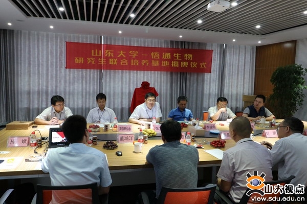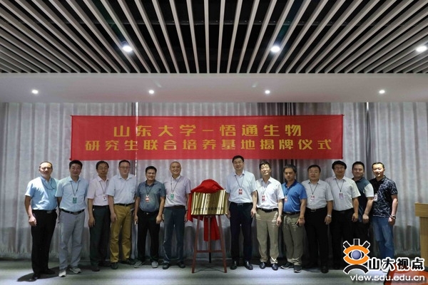 [本站讯]近日,山东大学——悟通生物研究生联合培养基地揭牌仪式在济南药谷悟通生物科技有限公司举行。山东大学研究生院副院长张文玺与悟通生物科技有限责任公司董事长卫洁为“山东大学—悟通生物研究生联合培养基地”揭牌。