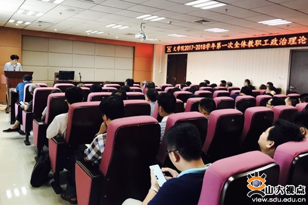 [本站讯]近日,文学院在中心校区举行了2017-2018学年第一次全体教职工政治理论学习。山东大学终身教授袁世硕及全体教职工参加了此次学习,院长郑春出席会议并讲话,院党委副书记张帅主持。
