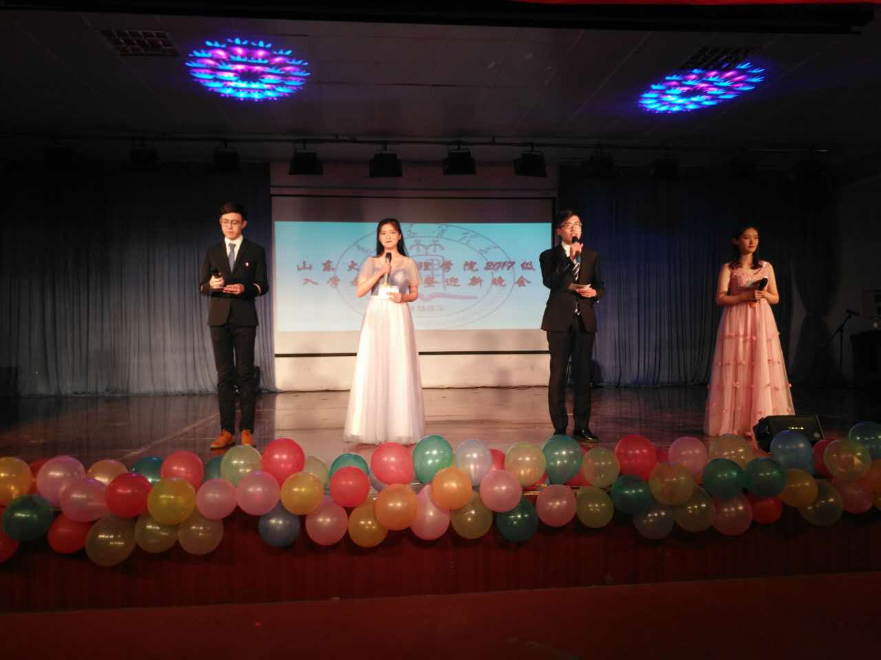 迎新晚会节目精彩纷呈。悠扬小调《济南济南》带同学们领略济南了美丽风光;辅导员和学生的合作的舞台剧则带同学们回忆了苦中有甜、累中有爱的军训生活;民族舞和现代舞的碰撞与交融让观众感受到了不一样的风情,民乐合奏则让人深深的沉醉其中。此外,还有有婉转动听的二胡独奏,炫酷的悠悠球技术展示,安静温暖的民谣演唱,诙谐幽默的小品表演。几个社团带来了精彩的表演和展示:酷炫的轮滑和街舞秀、庄重的的成人礼仪式展示、高雅的小提琴合奏、帅气的梅花桩武术表演、精彩激烈的的辩论表演赛无一不赢得同学们的热烈掌声。排长倾情演绎的《那些花儿》更是将全场气氛推向了高潮,赢得台下阵阵掌声。整场晚会精彩不断,高潮迭起。最后,在气势磅礴的军训大合唱和热烈的掌声中,迎新晚会圆满落幕。