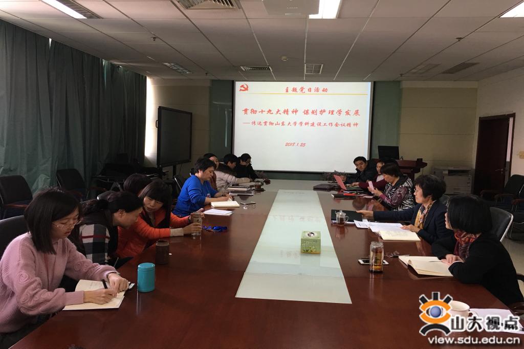 [本站讯]1月25日下午,护理学院在学院会议室举行主题党日活动,传达贯彻山东大学学科建设工作会议精神,部署学院学科建设发展的相关事宜。护理学院党委书记李峰及全体教职工参加活动。