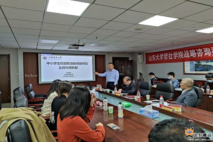 [本站讯]4月9日下午,山东师范大学张文新教授于知新楼作以“校园欺凌的班级特征及其作用机制”为题的学术报告。他指出,以往的心理学研究多集中于欺凌者和被欺凌者的个体因素分析,而较少从群体互动的角度做出实证分析,因此在研究中应当将欺凌的同伴群体和环境纳入解释机制中。他从班级等级地位和班级规范方面具体解释了欺凌发生的机制,在高地位等级性的班级中,社会支配性目标会预测随后欺凌行为的增加。最后,张文新教授总结了研究结论并提出了相关解决方案。