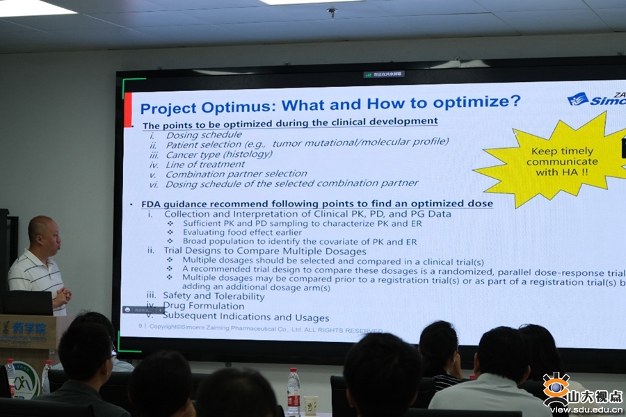 [本站讯]8月21日上午,药学院临床药学与临床药理学团队举办创新药物临床研究与评价讲坛。药学院副院长李敏勇、临床药理研究所所长赵维出席活动,比利时荷语鲁汶大学Karel Allegaert教授、先声再明临床药理负责人陈嘉博士作报告,分享临床药理研究心得。活动由先声药业临床药理部门杨阳女士主持,药学院临床药学与临床药理学、药理学及免疫药理学等专业师生参加活动。Karel Allegaert教授(欧洲药品管理局专家、比利时皇家医学院成员)就发育药理学及儿童药物研发现状作了详细介绍,从学术科研和政策监管方面分享了儿童临床药理的研究心得。陈嘉博士通过分享抗肿瘤药物研发实例,展示了PKPD技术在抗肿瘤药物早期临床试验剂量优化中的地位和作用。
