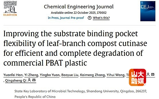 [本站讯]近日,微生物改造技术全国重点实验室祁庆生教授团队在国际期刊Chemical Engineering Journal在线发表了题为“Improving the Substrate Binding Pocket Flexibility of Leaf-Branch Compost Cutinase for Efficient and Complete Degradation of Commercial PBAT Plastic”的研究成果,为PBAT塑料废弃物的生物降解与回收提供了一种全新的高活性催化剂。本研究由山东大学微生物改造技术全国重点实验室教授祁庆生、副研究员苏田源共同指导完成。重点实验室博士研究生韩远飞为论文第一作者。山东大学为本研究的第一完成单位和通讯作者单位。