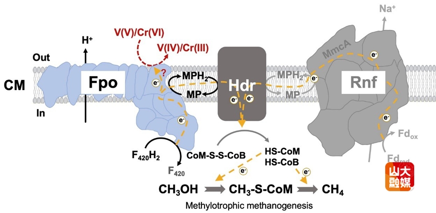 钒(V)与铬(Cr)均是具有氧化还原依赖性的有毒重金属元素,其迁移能力与毒性随价态不同而变化,其中五价钒[V(V)]和六价铬[Cr(VI)]的毒性显著高于其还原形态。微生物还原技术为这类污染提供了一种可持续的修复策略,然而与细菌相比,古菌在还原机制方面的研究仍较为有限。由于产甲烷古菌在厌氧环境中是驱动钒/铬还原的关键生物类群,本研究选取模式产甲烷古菌——Methanosarcina acetivorans,系统探究其对钒/铬的还原与解毒机制。通过分析该菌对不同浓度V(V)和Cr(VI)的生态生理响应,并结合钒/铬在处理前后的形态转化与亚细胞分布,证实M. acetivorans能够通过分流产甲烷过程所产生的胞内电子,实现胞外V(V)与Cr(VI)的还原。进一步遗传学与生化分析表明,先前报道中参与胞外三价铁还原的多血红素c型细胞色素,在V(V)与Cr(VI)还原过程中并不起主要作用;相反,在产甲烷古菌中高度保守的膜结合F420(吩嗪氧化还原酶复合体)参与了V(V)与Cr(VI)的还原反应。上述发现深化了对产甲烷过程与钒/铬形态转化耦合机制的认识,也为利用古菌驱动钒/铬污染环境的生物修复提供了理论支撑。