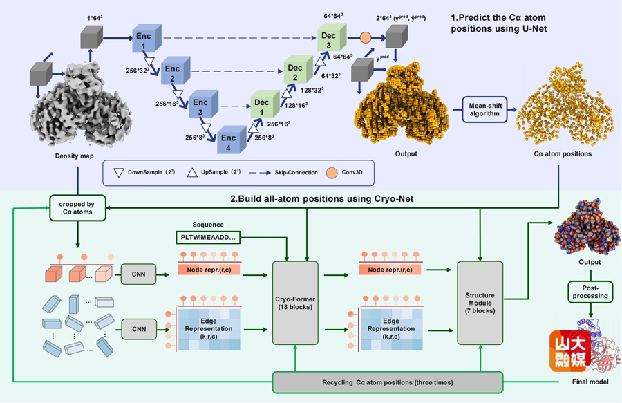 [本站讯]近日,山东大学数学与交叉科学研究中心、教育部非线性期望前沿科学中心杨建益教授团队在冷冻电镜(cryo-EM)原子结构建模算法研发中取得突破性成果,相关研究以“CryoAtom improves model building for cryo-EM”为题发表于Nature子刊Nature Structural & Molecular Biology。数学与交叉科学研究中心博士研究生苏宝泉为第一作者。中心教授杨建益、彭珍玲,德国明斯特大学Alexey Amunts为共同通讯作者。西湖大学生命科学学院黄坤为合作作者。