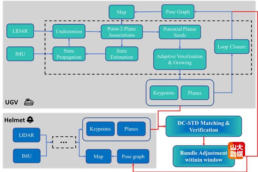 本文设计了一种基于轻量级LiDAR-惯性系统的穿戴式头盔和UGV(无人车)平台协同测绘系统。系统执行灵活的紧耦合激光雷达惯性里程计来跟踪不同载体的运动状态,为了在异构平台之间创建链接,提出了一种Delaunay约束稳定三角描述符(DC-STD)的位置识别方法。利用整个场景的大型结构平面构建的全局结构以及由显著关键点构成的局部特征,我们的方法能够准确识别共视区域,从而构建多机器人之间的联系。此外,利用Delaunay三角形的稳定结构快速估计两个坐标系之间的相对变换,通过将共轭平面验证与束调整(BA)平滑地结合,以消除不可靠的匹配与关联,最后求解具有密集连接边的联合位姿图,获得全局统一的三维地图,方法整体流程如图1所示,自主搭建的实验设备与实验场景如图2所示,实验对比分析结果见图3—图5。