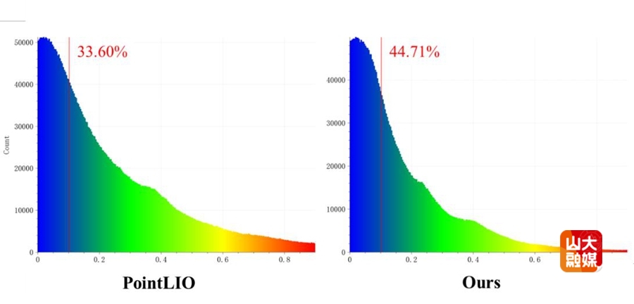 总体而言,本文系统在两种激光雷达的试验中均取得了最低APE(绝对位置误差),在头盔与UGV的轨迹高度重叠的情况下,系统整体提升效果翻倍。为了评估三维地图的精度,选择高精度MLS作为参考地图,该地图是由Alpha3D通过高精度车载惯性导航系统(INS)采集的。与其他现有先进SLAM系统(PointLIO、LIOSAM 和 FastLIO2)相比,我们的系统实现了最佳性能,Ouster 提高了 8.68%、14.49%、12.21%,MID 提高了 9.0%、15.71%、8.68%。更重要的是,用头盔生成的地图进行相同的评估。但由于该平台的运动剧烈,只有PointLIO能够获得满意的结果,而FastLIO2和LIOSAM则遇到严重漂移。实际建图精度比较如图5所示,比我们的系统下降了 11.11%。
