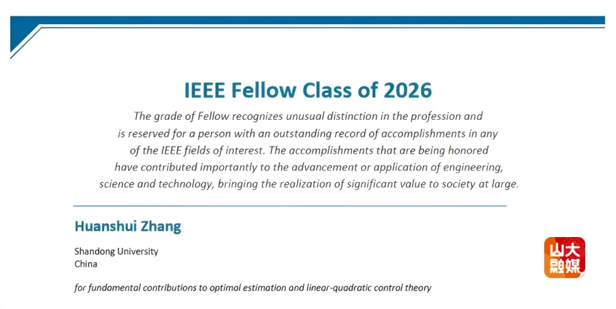 [本站讯]11月27日,美国电子电气工程师学会(Institute of Electrical and Electronic Engineers,IEEE)公布了2026年度IEEE会士(Fellow)名单。控制学院教授张焕水因其对最优估计和线性二次控制理论的基础性贡献入选。