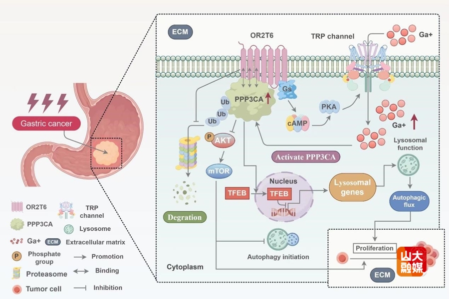 胃癌是全球范围内发病率和死亡率均位居前列的恶性肿瘤,晚期患者预后差,寻找新的治疗靶点迫在眉睫。细胞自噬在癌症中的作用复杂且具有“双刃剑”效应,其在胃癌中的具体调控机制尚不完全清楚,限制了相关治疗策略的开发。近年来,研究发现原本负责嗅觉感知的嗅觉受体(ORs)家族成员OR2T6在多种癌症中异常表达并发挥功能,为肿瘤研究提供了全新视角。