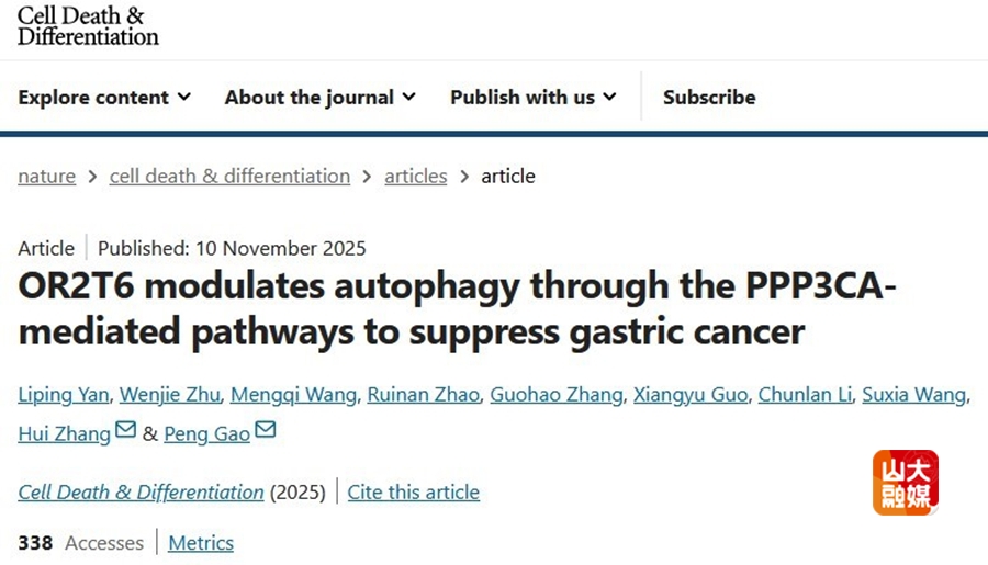 [本站讯]近日,基础医学院病理学系/齐鲁医院病理科高鹏教授团队在国际权威期刊Cell Death & Differentiation(IF 15.4)发表了题为“OR2T6 modulates autophagy through the PPP3CA-mediated pathways to suppress gastric cancer”的研究论文。该研究首次系统揭示了嗅觉受体OR2T6在胃癌中作为抑癌基因的功能,并阐明了其通过独特的“启动并阻断”自噬过程,以及抑制细胞增殖的双重机制,为胃癌的预后判断和靶向治疗提供了新的潜在靶点。学院教授高鹏、副研究员张慧为共同通讯作者,病理学博士研究生闫丽萍、副研究员朱文洁为共同第一作者。