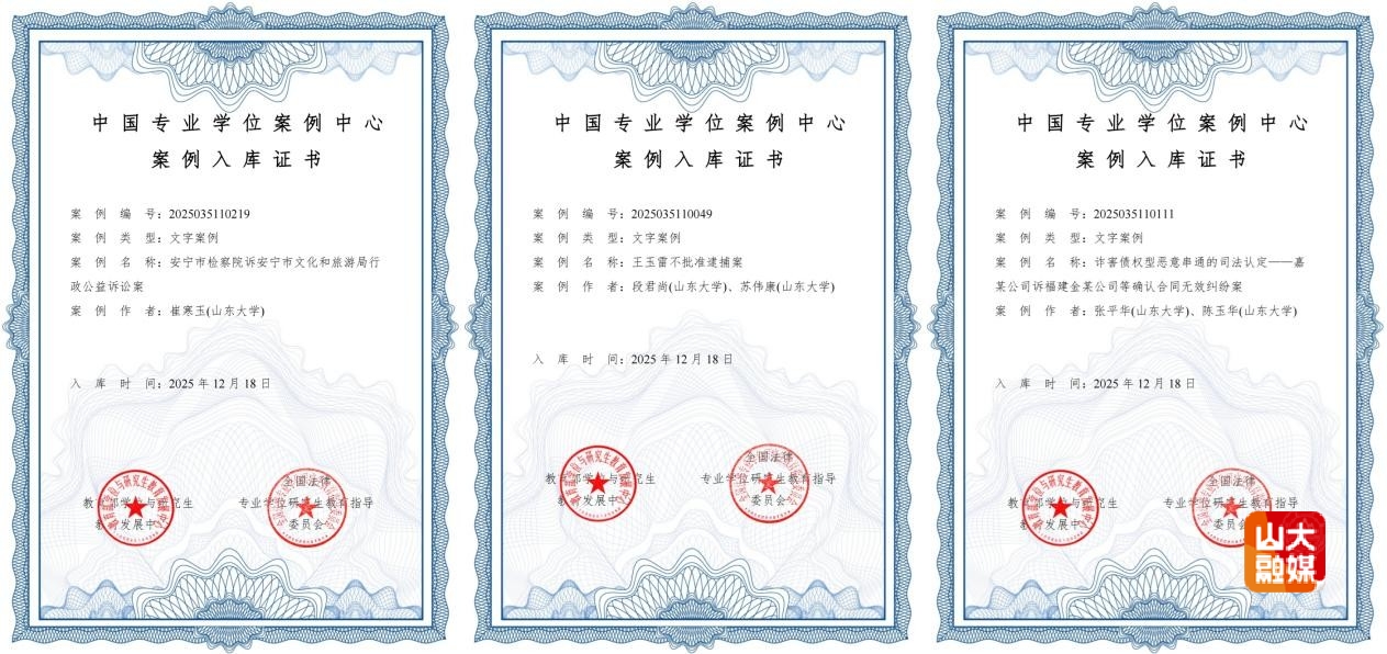 [本站讯]12月18日,由山东大学法学院教师崔寒玉、段君尚、张平华分别作为第一案例作者的3项文字案例被中国专业学位案例中心收录。