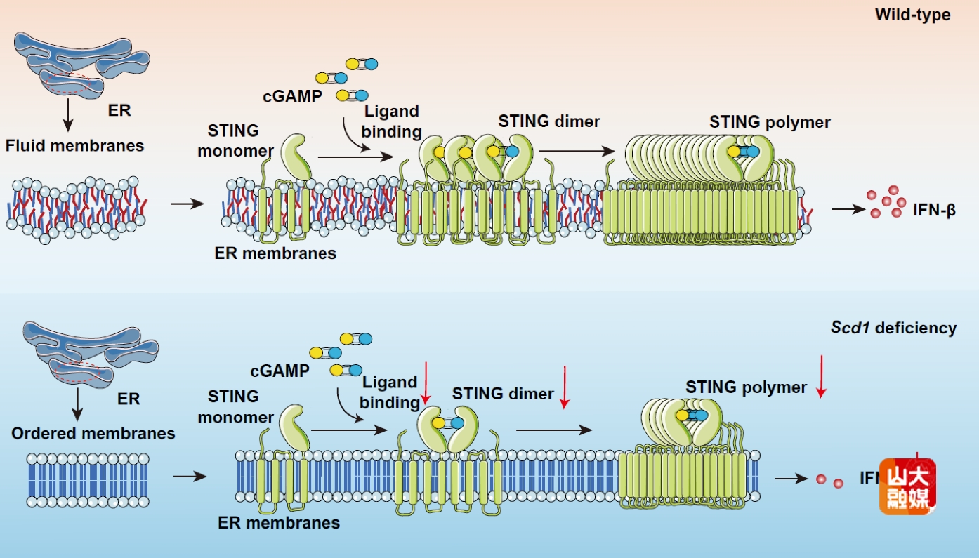 [本站讯]近日,基础医学院赵伟教授团队在《美国国家科学院院刊》(PNAS)发表题为“SCD1 licenses STING signaling through fatty acid desaturation–mediated membrane remodeling”(SCD1通过脂肪酸去饱和介导的膜重塑驱动STING信号通路)的研究论文。该研究发现,代谢酶SCD1可通过调控内质网膜的脂质组成与物理特性,决定固有免疫核心蛋白STING的激活状态,从而精密调控抗病毒免疫反应。基础医学院博士后秦丹慧为第一作者,赵伟教授为通讯作者。山东大学为第一作者和通讯作者单位。