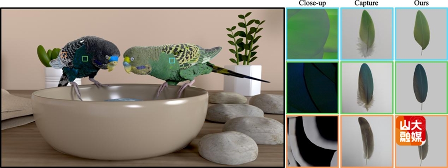 该研究聚焦鸟类羽毛实时渲染的效率与真实感平衡难题,传统羽毛渲染方法存在内存开销大、渲染速度慢、难以还原真实羽毛光学特征等问题。针对这一瓶颈,论文提出程序化多尺度实时羽毛外观建模框架,仅需单张羽毛照片即可完成建模,构建紧凑层级化表示并设计专用散射模型与光泽效果;通过自适应多尺度查询与遮蔽处理,实现高保真、抗锯齿的实时渲染。该方法内存占用仅为传统显式几何模型的0.02%,可高效还原羽毛蓬松质感与结构色,为游戏、虚拟现实、影视特效等领域的数字鸟类渲染提供了全新高效解决方案。山东大学为论文第一完成单位,软件学院硕士研究生陈翔为该篇文章的第一作者,软件学院研究员朱君秋为通讯作者。合作作者包含山东大学软件学院博士研究生王寿义、教授王璐,墨尔本大学助理教授陈滨,曼彻斯特大学助理教授Zahra Montazeri,穆罕默德·本·扎耶德人工智能大学教授闫令琪。