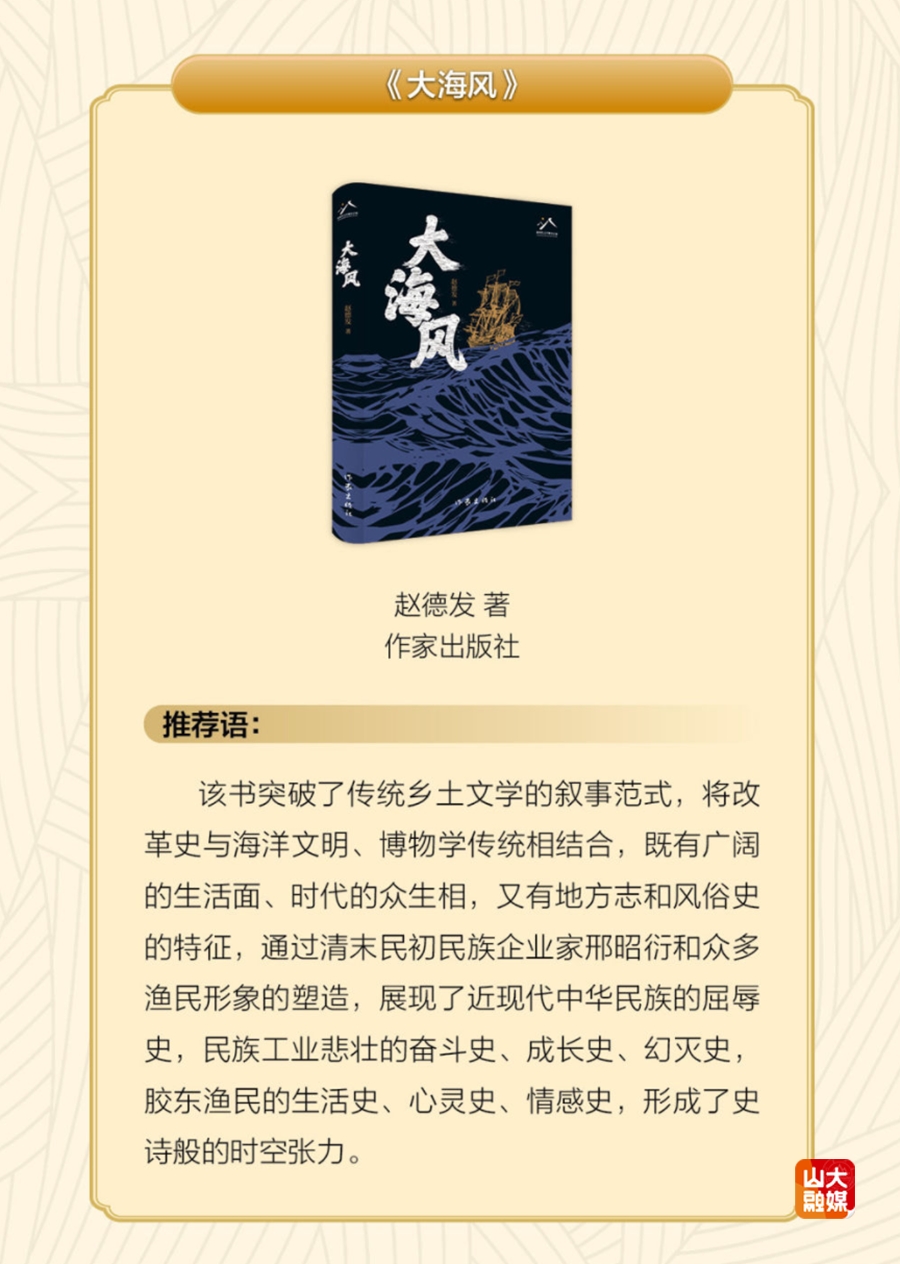 《大海风》是赵德发教授酝酿三十年的心血之作。作为其首部海洋题材长篇小说,《大海风》以黄海之滨为背景,全景式书写中国北方渔业与航运史,铺展时代更迭的壮阔画卷与精神脉络。作品创作之初便备受关注,2021年先后入选山东省委宣传部“齐鲁文艺高峰计划”、日照市委宣传部重大主题创作扶持项目,入选中国作协“新时代文学攀登计划”、国家“十四五”重点出版物出版规划。