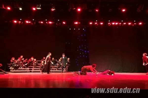 活动上,莎士比亚文学戏剧专家Duncan Lees带来题为《莎士比亚与局外人》的精彩演讲。来自英国莎士比亚环球剧院的专家Jack Murray和Olivia Mace分别通过游戏的方式和师生们互动,并对他们的表演给予了充分肯定。随后,山东大学外语学院尼诺剧社的同学们表演了《哈姆莱特》经典剧目。表演在外国语学院合唱团优美舒缓的乐曲中开始,尼诺剧社用全英文再现了笔下的兄弟阋墙、宫廷阴谋、家庭纷争、为爱殉情,以及狡猾放荡的绅士、鬼怪精灵的仙女、憨厚耿直的家仆、刚正不阿的将军。剧社50余人参与演出,演出阵容庞大,由外语学院教师戏剧博士冯伟担任指导,尼诺剧社社长陈曦兼任导演与主演。演员演技精湛,感情饱满,将剧中的各种人物角色表现得淋漓尽致,赢得现场观众的一致好评。活动最后,莎士比亚环球剧院专家Georghia Ellinas讲述了亨利五世与暴风雨的故事,活动在高潮中结束。山东省外事办公室、山东省文化厅、济南市外事办公室、济南大学相关人员出席相关活动。