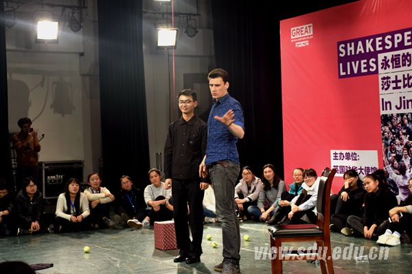 Nick Low在致辞中表示,2016年是莎士比亚和汤显祖逝世400周年,英国驻华使馆很高兴携手山东大学,通过文学研讨、舞台表演、互动体验、视频播放等方式,使师生们体验并了解莎士比亚作品,促进英中两国的友好文化交流。山东大学国际事务部副部长宋春玲致辞欢迎Nick Low一行。她表示,中英两国同为文化大国,以各自独特的智慧为人类的文明进步作出了卓越的贡献,中英两国人民始终相互欣赏彼此优秀的文明成果。山东大学愿继续发挥优势,作中英人文交流的友好使者。外国语学院院长王俊菊在讲话中感谢了英国驻华使馆为师生带来的学术与艺术盛宴,表示山大外文系首任系主任梁实秋是中国独自翻译《莎士比亚全集》的第一人,莎士比亚的研究、翻译和教学是学院的传统和优势,学院将继续在研究与教育领域促进两国文化交流。
