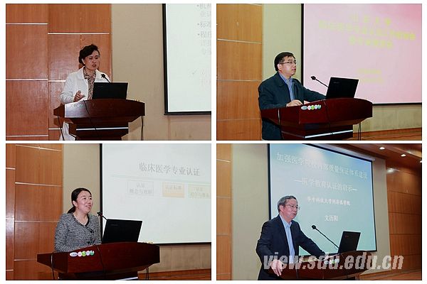 教育部临床医学专业认证委员会秘书处办公室主任、北京大学医学部教育处副处长谢阿娜与原同济医科大学副校长、华中科技大学同济医学院文历阳教授分别作了专题报告。谢阿娜主要从认证的概念与理解、认证标准、认证的程序与准备作了全方位、深入的讲解,并结合北京大学医学部临床医学专业认证的经历提供了许多宝贵的经验。文历阳教授就如何加强医学院校内部质量保证体系建设作了专题报告。他强调外部质量保证体系是通过内部质量保证体系起作用,内部质量保证体系要体现外部质量保证体系的基本要求,两者是息息相关、不可分割的。他分别从内部质量保证体系的组成要素、建设的基本要求和主要环节等方面阐述了如何建立一个滚动式发展、螺旋式上升的内部质量保证体系。