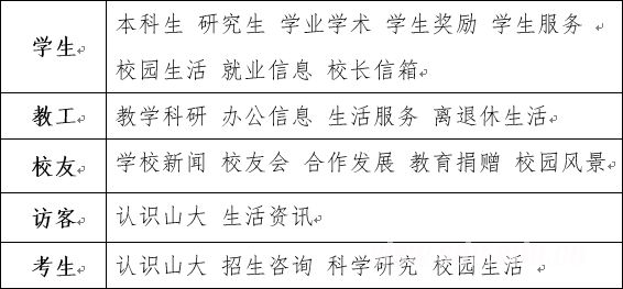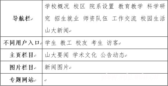 3.以现有山东大学主页栏目或下表所提供的内容为参考进行设计,也可根据个人创意对相应栏目及布局等进行适当调整。
