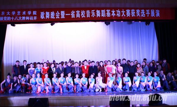 [本站讯]11月6日,艺术学院在中心校区科学会堂举办了迎接党的十八大胜利召开歌舞晚会暨山东省第五届高校音乐舞蹈基本功大赛获奖选手展演。学校合作发展部部长王飞,艺术学院院长李晓峰、党委书记史永志观看演出。