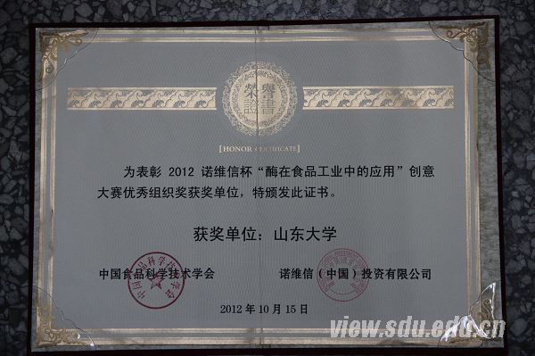 诺维信杯“酶在食品工业中的应用”创意大赛是由中国食品科学技术学会与诺维信(中国)投资有限公司共同举办的旨在发掘学生想象力与创造力、给学生们一个展现自我能力舞台的大赛,是食品科学领域具有较大影响力的大学生科技创新赛事之一。本次大赛是为促进酶制剂在食品工业中应用而举办的全国性竞赛,今年首次将参赛高校定向为山东省内高校,本届共有来自省内6所高校的近百份参赛作品参赛。大赛设一等奖1名,二等奖2名,三等奖5名,优秀奖10名。