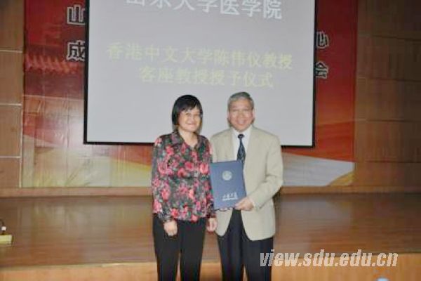 [本站讯]9月21日,香港中文大学生物医学院院长陈伟仪受聘为医学院客座教授。授予仪式暨学术报告会在山东大学趵突泉校区举行。医学院常务副院长龚瑶琴向陈伟仪教授颁发了客座教授聘书。中国科学院院士、香港中文大学华南肿瘤学国家重点实验室主任、山东大学特聘客座教授孔祥復教授出席授予仪式。