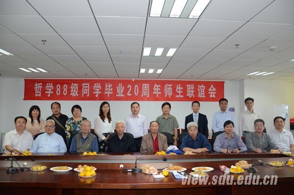 哲学系历任系主任臧乐源、周立升、谭鑫田及学院副院长王新春、宋全成,哲学系88级任课教师汪健、颜炳罡、王晋生等,勉励同学们继续恪守母校教诲,秉承诚实、诚信的原则和朴实、勤奋的品格,用实实在在的业绩为母校争光。83岁高龄的臧乐源教授还即兴赋诗:“风风雨雨二十载,书生本色自能爱。英姿勃发显身手,建功立业硕果在。今日泉城再相聚,万千往事心上来。母校丰碑高高立,育人万千与各界。老师挚爱传智慧,同学情谊暖心怀。民富国强逢盛世,多娇江山添新彩。不惑之年树壮志,再创辉煌迈大步。”他对生命和事业的热情和激情、对学生的厚望和期待,感染了在场所有人。
