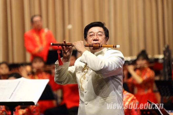 音乐会由山东大学(威海)艺术学院民乐团倾情演出,国家一级作曲家、著名指挥家、中国民族管弦乐学会常务理事任新宁,山东大学(威海)艺术学院民乐教研室主任周婷婷担任乐团指挥。音乐会在《金蛇狂舞》中拉开帷幕,热情激昂的旋律、铿锵有力的节奏营造出浓浓的节日氛围。《红楼梦序曲》极富张力,勾起观众对经典的电视剧《红楼梦》的回忆,使人感悟世事的变幻,人生的无常。由教师徐驰演唱的新疆民歌《怀念战友》歌声悠扬,旋律婉转动听,表达了对战友深厚的怀念之情。《立志》描绘出黄土高原苍凉广阔的画面,展现了晋商的铮铮风骨以及不畏艰难、砥砺前行的民族精神。《中国电影音乐联奏》乐曲编排巧妙精致,跌宕起伏,使得观众脑海浮现出经典电影的精彩画面。充满异域风情的乐曲《丝绸之路》充分发挥民族乐器音色特点和演奏手法,丰富的音乐文化让人充满了对丝绸之路的绝美遐想,展现了当代民乐的无限创意。由老师姚桂丽演唱的《我的好妈妈》歌声婉转细腻,表达了对母亲深深的爱和美好祝福。唢呐独奏《百鸟朝凤》旋律热情欢快,表现了大自然生机勃勃的景象。由吴静寅教授演唱、张平教授竹笛协奏的《草原上升起不落的太阳》用充满诗情、宽广舒展又富于激情的旋律描绘了内蒙古大草原的自然风貌,表现了草原牧民奔放开朗的性格,抒发了他们热爱家乡、赞美生活、对党和领袖的歌颂。《我的祖国》赞颂了祖国美丽的景色,表达了中国人民的家国情怀和爱国主义情感。《花好月圆》曲调流畅活跃、情趣盎然,生动勾勒出人们欢庆节日的场景。返场曲《射雕英雄传》经典熟悉的旋律,乐团指挥与现场观众的互动,将音乐会推向了高潮,赢得了阵阵掌声。最后,音乐会在观众们的意犹未尽中落下帷幕。