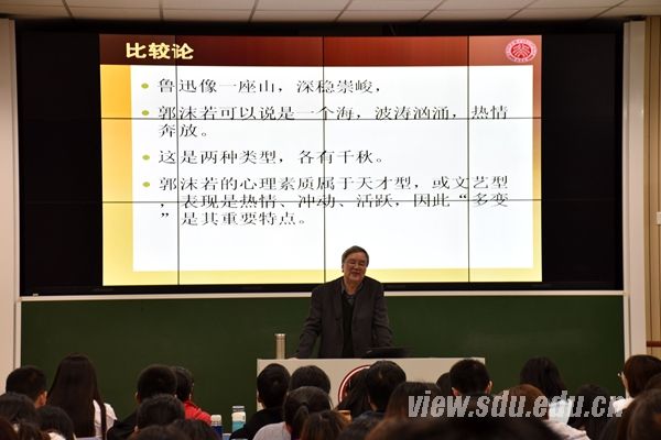 课堂上,温儒敏教授讲授了《郭沫若的<女神>与“两极阅读现象”》。他认为,“两极阅读现象”存在于一般读者与专业阅读人士之间,作为一名中文系学生,阅读作品不能偏重于个人的审美与行时的潮流,要注重从历史发展的链条中考察作品,确定其特色、价值、影响与地位。基于这个观点,他以郭沫若的《女神》为例,从以往对《女神》的文学史评价入手,用直观感受、设身处地、名理分析的“三步阅读法”带领大家去除“两极阅读”的偏颇。他表示,读一首诗首先要抓住它给人的第一印象,并将其与“历史现场感”相结合,然后再对作品进行分析,而不是先入为主,从概念到概念。同时,他对读者的阅读行为进行了分析,表示读者要与作品进行互动,形成一个“阅读场”。他还从郭沫若本人的成长背景以及写作风格等进行分析,解释了为何《女神》在五四时期与在八九十年代之后得到截然不同的评价。温儒敏教授表示,学生要“知人论世,知人论诗”,不应该片面地评价一个诗人,不能把文学评价与政治评价混为一谈,要对诗人、艺术家有着更多的包容,要注意用历史唯物主义的观点和方法论来看待问题。