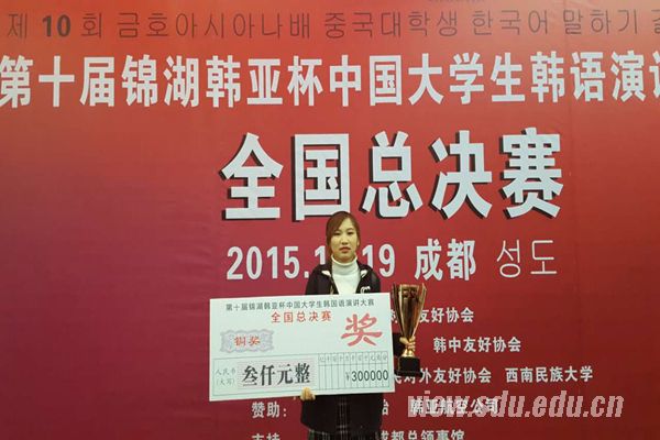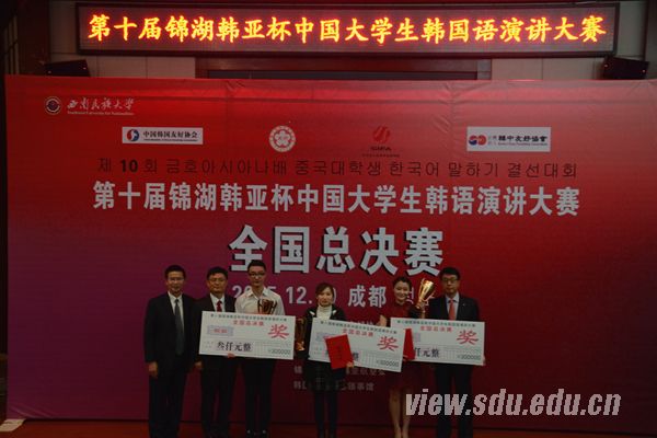 [本站讯]12月19日,由中国人民对外友好协会、中韩友好协会、韩中友好协会联合主办,四川省人民对外友好协会、西南民族大学承办的第十届锦湖韩亚杯中国大学生韩语演讲大赛全国总决赛在西南民族大学航空港校区北区国际会议报告厅举行。中韩友协副会长,首任驻韩大使张庭延先生,韩中友好协会副会长、锦湖韩亚集团副会长李元泰先生,西南民族大学校长曾明教授分别为本次大赛致辞。25名从全国各大分赛区晋级的优秀选手在决赛中展开了激烈的竞争,为各位评委及现场观众带来了一场精彩的演讲。山大外国语学院韩语系的12级赵航在总决赛中凭借精彩的发挥斩获铜奖。