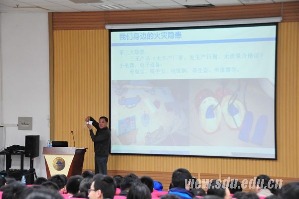 冯会林首先阐明了山大宿舍的三大现状“面积广、人口多、历史久”。这些因素又给同学们带来了潜在的安全问题,因此宿舍安全意识极其重要。他总结道,同学们身边的火灾隐患主要在于违规使用大功率电器、三无产品等,并结合许多真实的例子向同学们强调了宿舍安全的重要性。张玉峰介绍了大学生的人身安全问题。他结合以往经验,给同学们介绍了从心理问题到诈骗绑架等大学生身边的安全风险,用具体的数据与许多真实鲜明的事例,从交通安全、财产安全、人身安全三个方面提醒同学树立安全意识。