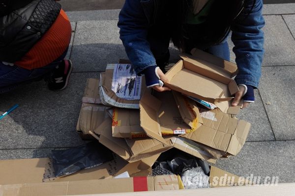 [本站讯]11月14日,山东大学思源社在中心校区举行了名为“举手之劳,爱洒殷陈”的志愿活动。此次活动主要内容是回收快递包装盒,将所得资金捐给殷陈小学的贫困孩子。思源社全体成员参加此次志愿活动。