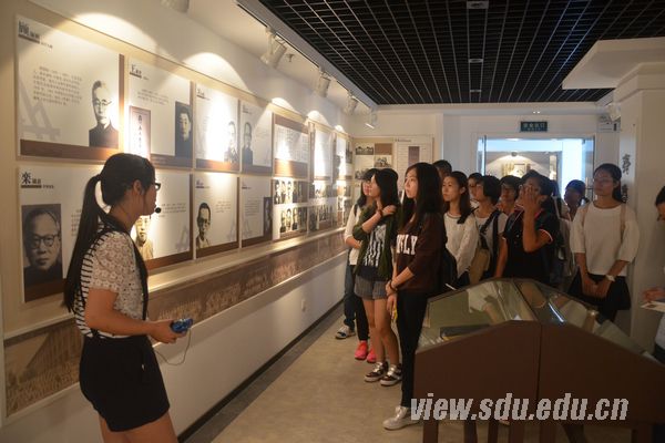 活动在中心校区举办,全体新生由兴隆山校区赶往中心校区,并在中心校区知新楼A座前广场与学院领导一起拍摄年级合照。接着,同学们在引导员的带领下,参观了山东大学校史馆。校史馆记录了百年山大的历史发展进程,是山大丰厚的文化底蕴、饱满的山大精神的见证。此次校史馆参观活动让同学们领略了山东大学悠久的历史、坎坷的经历、曲折的演进,深邃的内涵、厚重的文化、博大而宽广的胸怀,丰富多彩的校园景观、独具特色的学科建设、闻名遐迩的科学成就以及山东大学创办世界一流大学的决心和信心。同时,为纪念中国人民抗日战争暨世界反法西斯胜利70周年,同学们还参观了100个抗战家庭故事展。