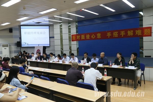 [本站讯]5月15日,山东大学软件园校区职能经理见面会举行。本次见面会由山东大学学生会调研权益部主办,邀请了校办、物业、图书馆、餐饮六部部门的经理、负责人与同学们面对面交流。
